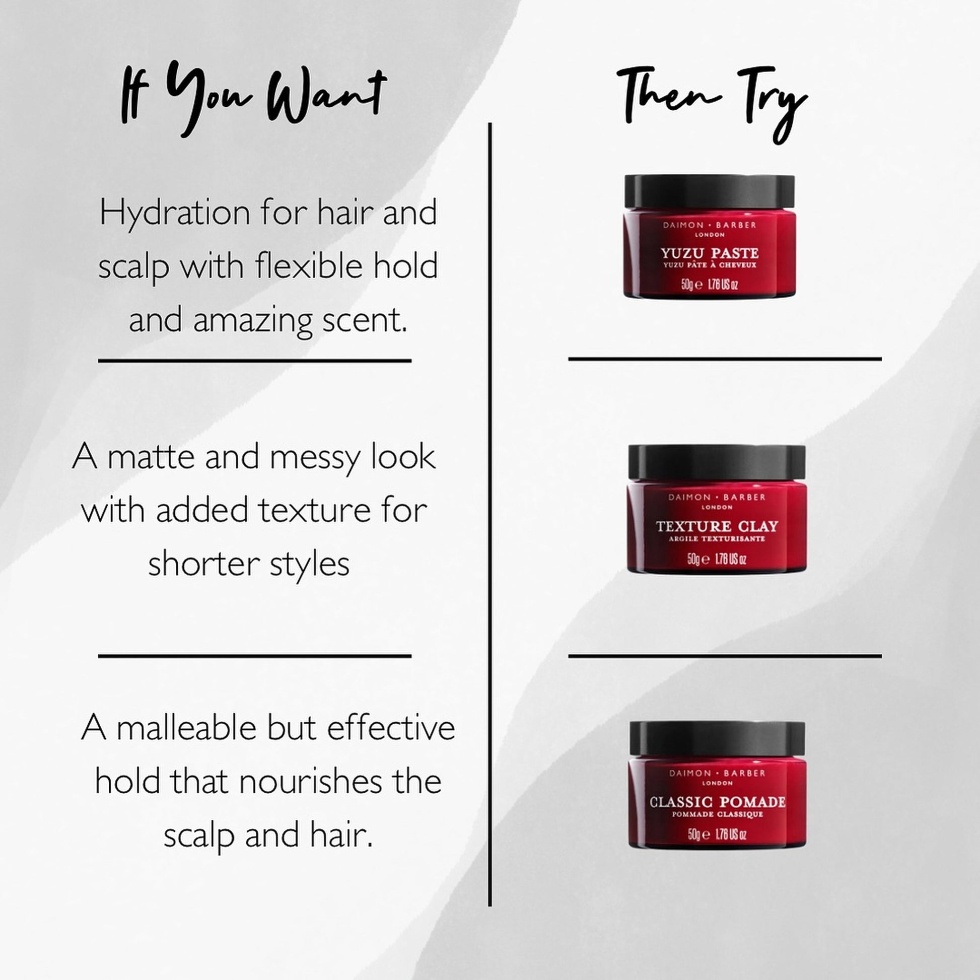 Upptäck Daimon Barbers prisbelönta Yuzu Paste - en unik stylingprodukt som kombinerar form och vård i en effektiv lösning. Med denna pasta kan du styla håret med flexibel, långvarig stadga och tillföra volym och textur, samtidigt som håret får näring och fukt på djupet.