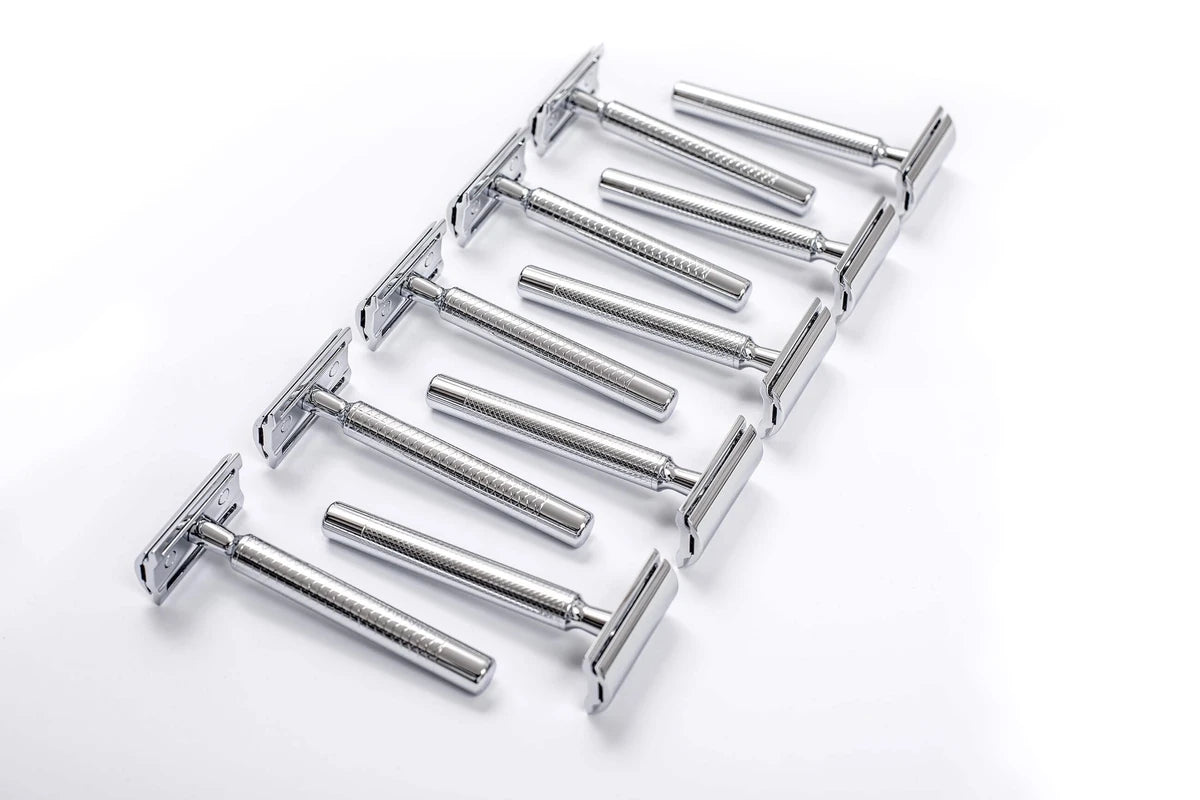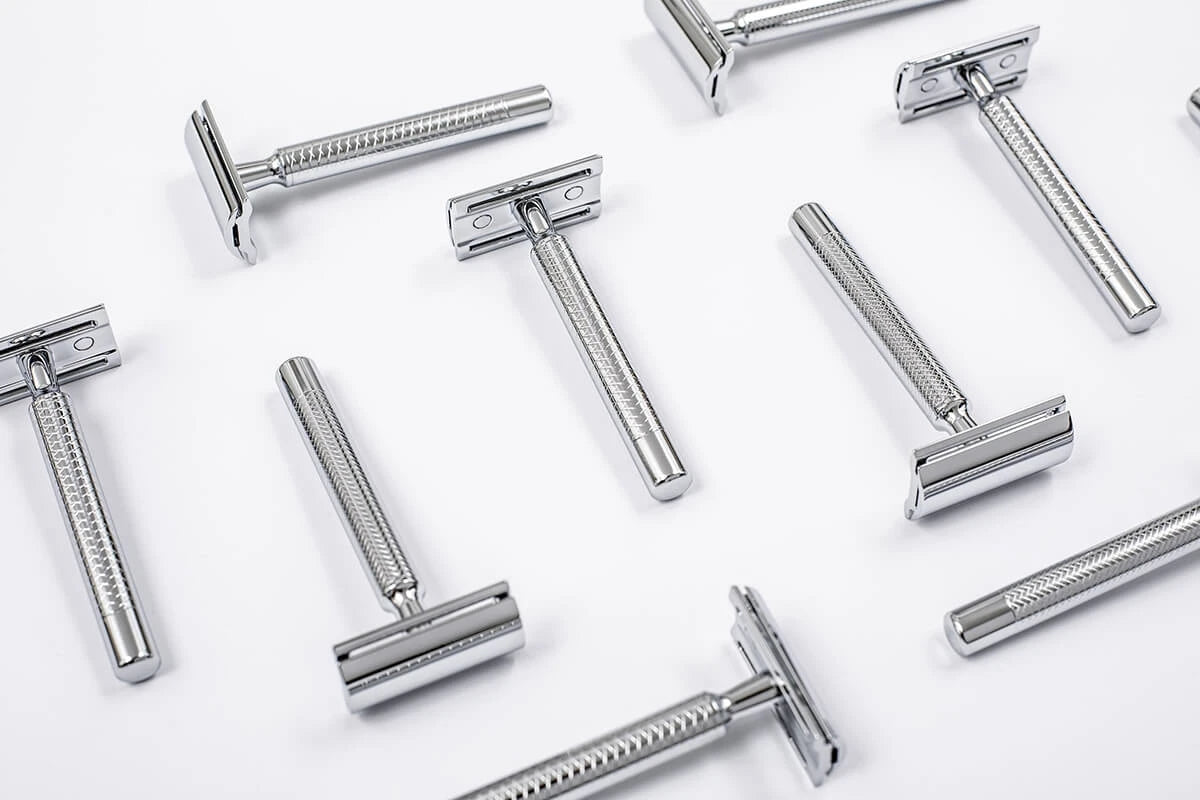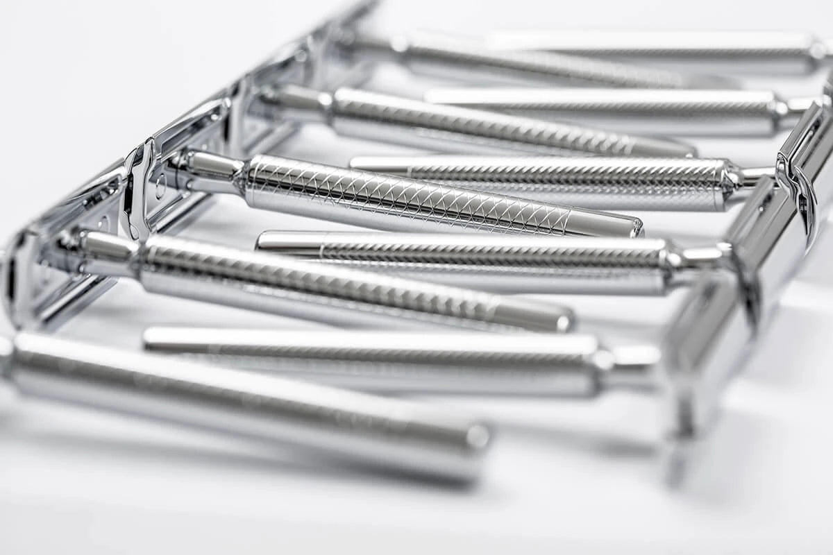 Det generösa bladgapet säkerställer optimalt lödderflöde och skyddar mot igensättning av hår och Rakskum. Handtaget är tillverkat av solid mässing för perfekt viktfördelning och balans vid användning, medan rakhuvudet är tillverkat av pressgjuten zink med en elegant kromfinish som skyddar mot korrosion och stöder den eleganta designen.