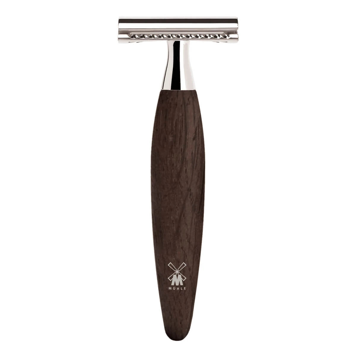 Denna modell från KOSMO-serien har handtag av exklusiv bog oak, tillverkad av stockar som har bevarats i mossar i upp till 3.000 år. Bog oak är känd för sina vackra randiga markeringar och djupa, mörka färgtoner som ger varje rakhyvel ett unikt utseende.