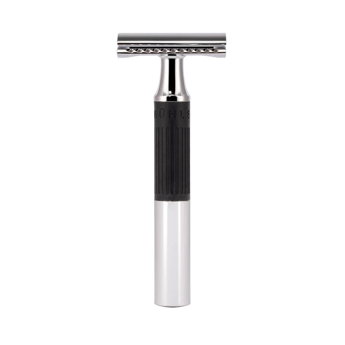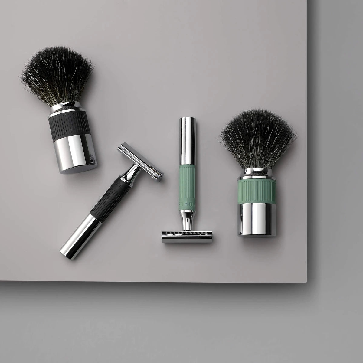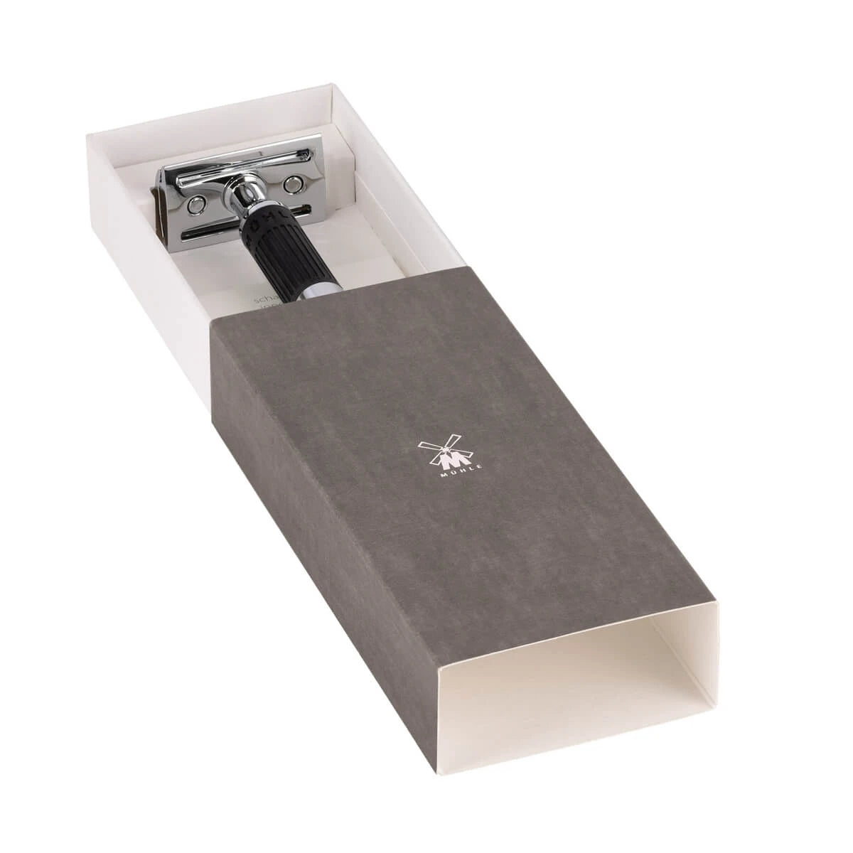 Säkerhetshyveln är tillverkad av robust förkromad metall, känd för sin höga korrosionsbeständighet och lyxiga glans. Det svarta, halkfria handtaget kontrasterar snyggt och ger en energisk och modern touch. Den räfflade ytan ger ett bekvämt och säkert grepp, medan vikten är anpassad för perfekt balans - rakningsupplevelsen är säker, vacker och elegant.