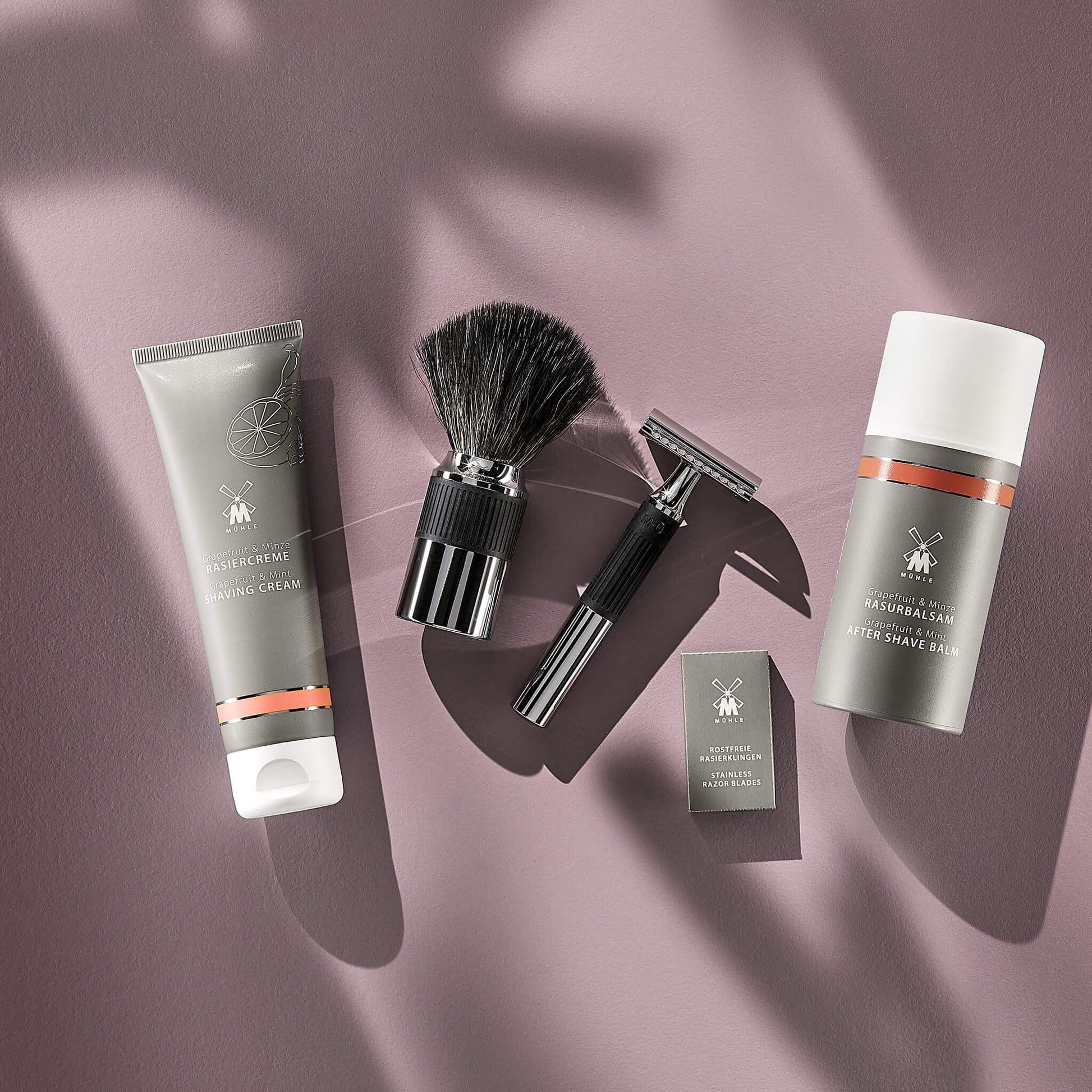 - Använd ett bra rakskum eller rak tvål, löddra med borste för optimalt skydd.