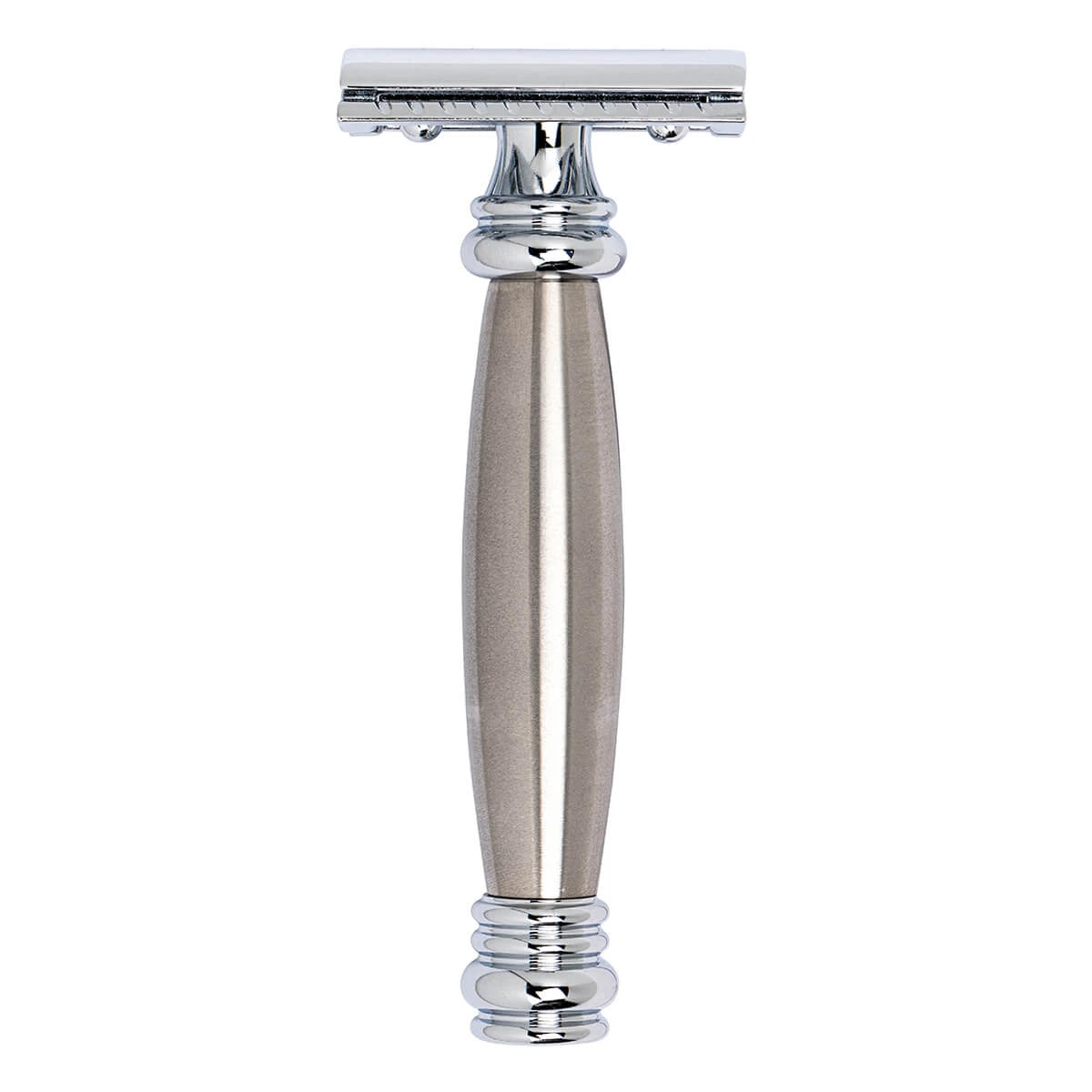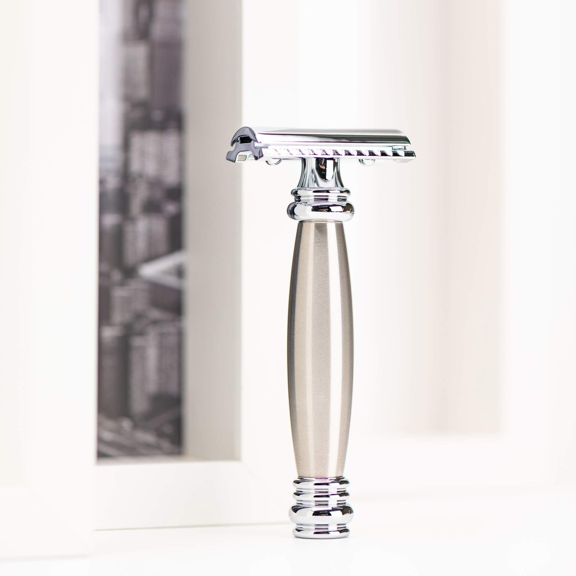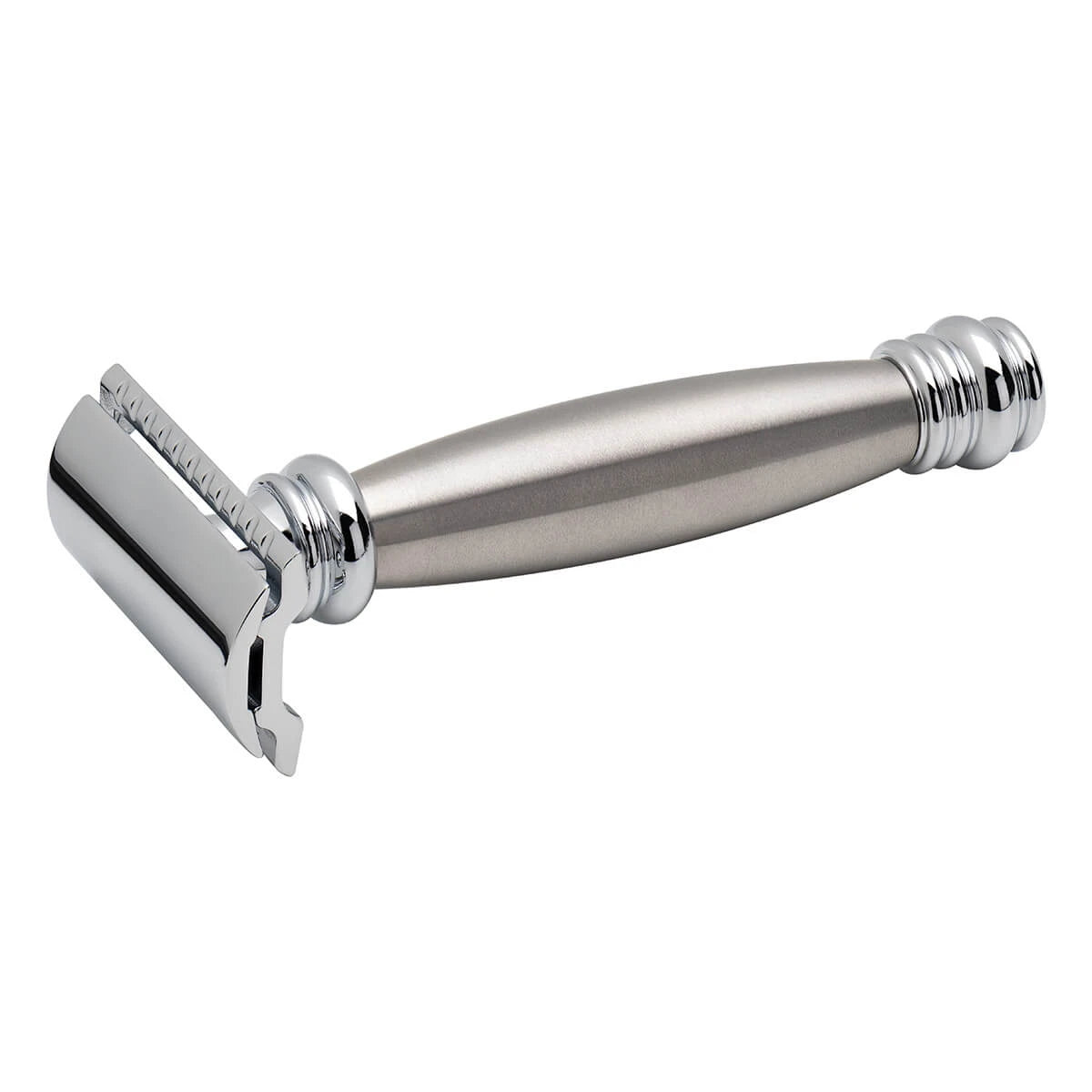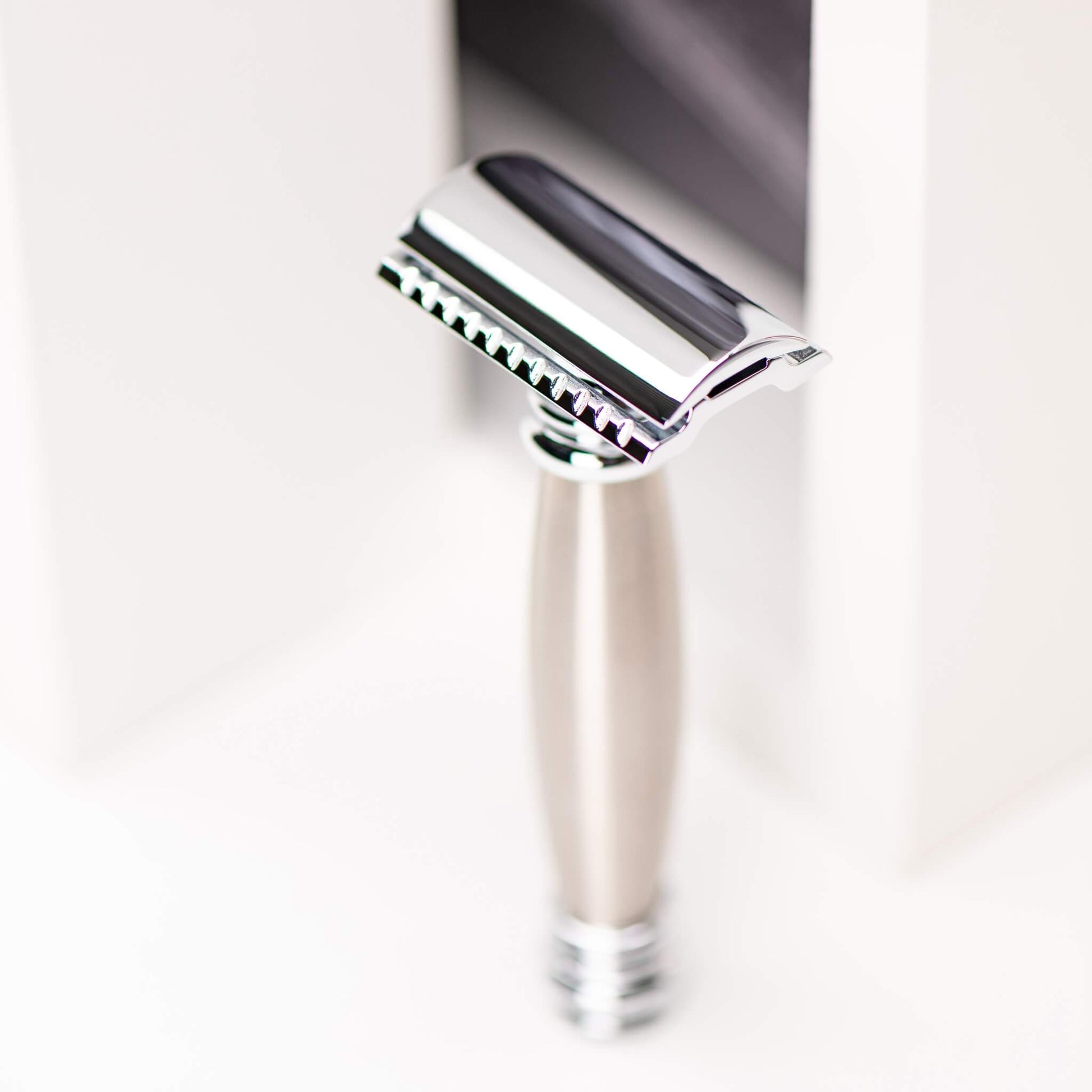 Merkur 43C är en av de tyngsta Säkerhetshyvlarna på marknaden och är gjord för dig som vill ha en solid och stabil rakning med minimal ansträngning. Med en vikt på 148 gram och ett starkt handtag i borstat stål får du en Säkerhetshyvel som ligger naturligt och säkert i handen.