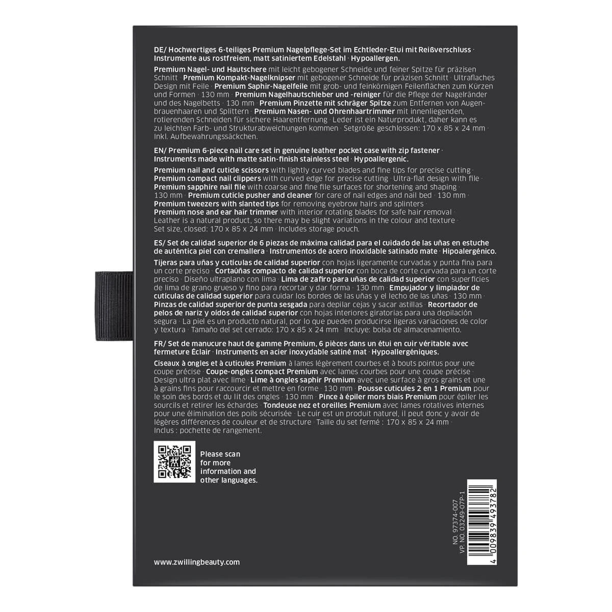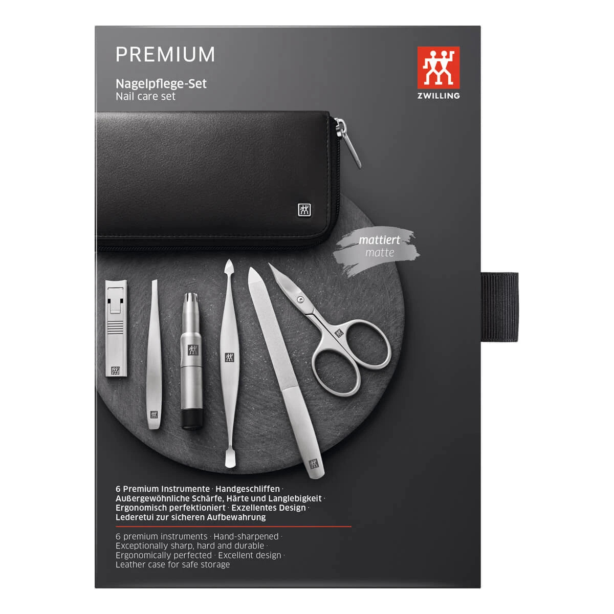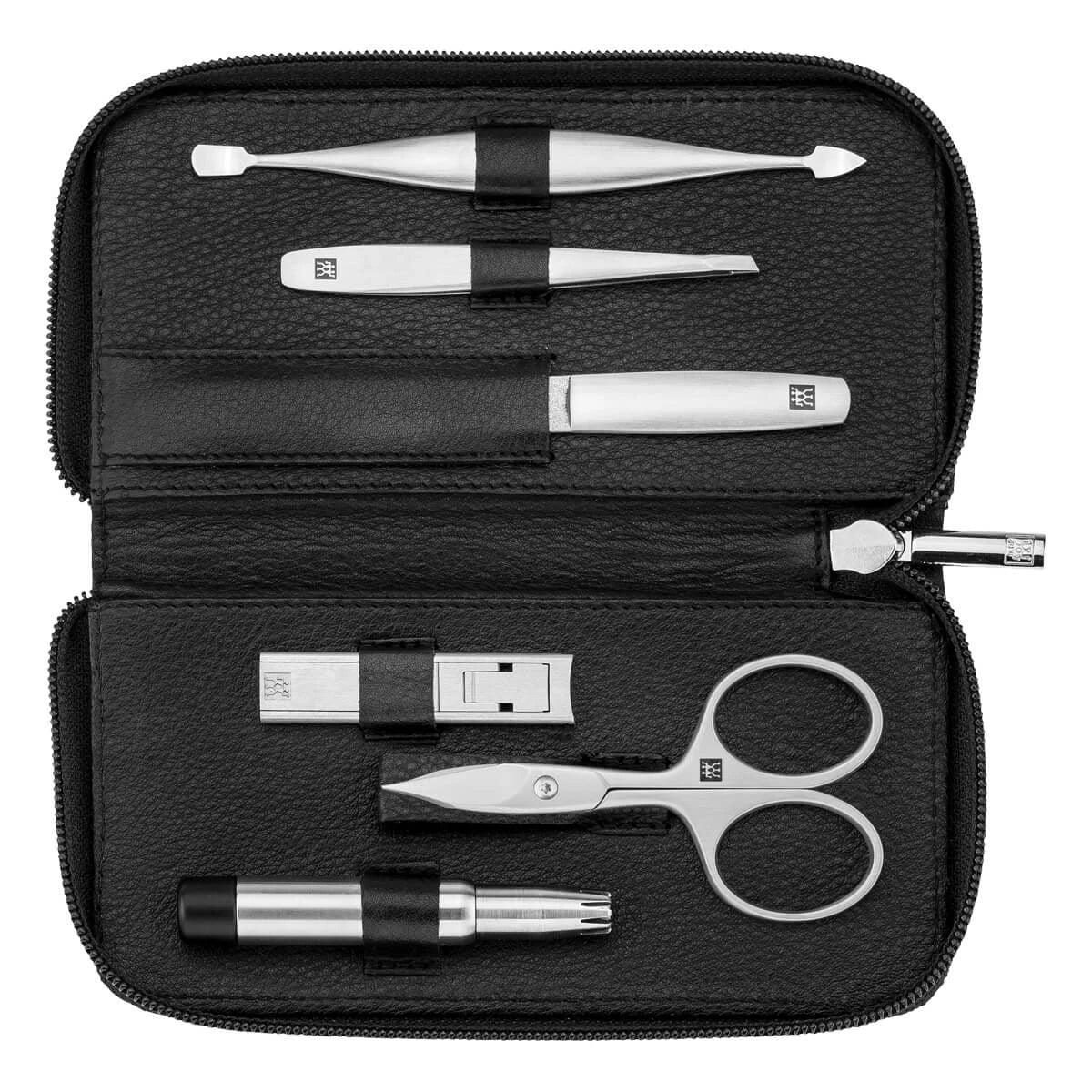 Med detta exklusiva Manikyrset i 6 delar från Zwilling får du allt du behöver för komplett och professionell nagelvård. Setet består av: Kompakt Nagelklippare, Nagel- och nagelbandssax, Nagelfil, Nagelbandspressare och -rensare, Pincett med vinklad spets, Trimmer för näs- och öronhår.