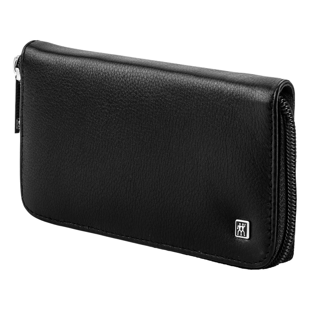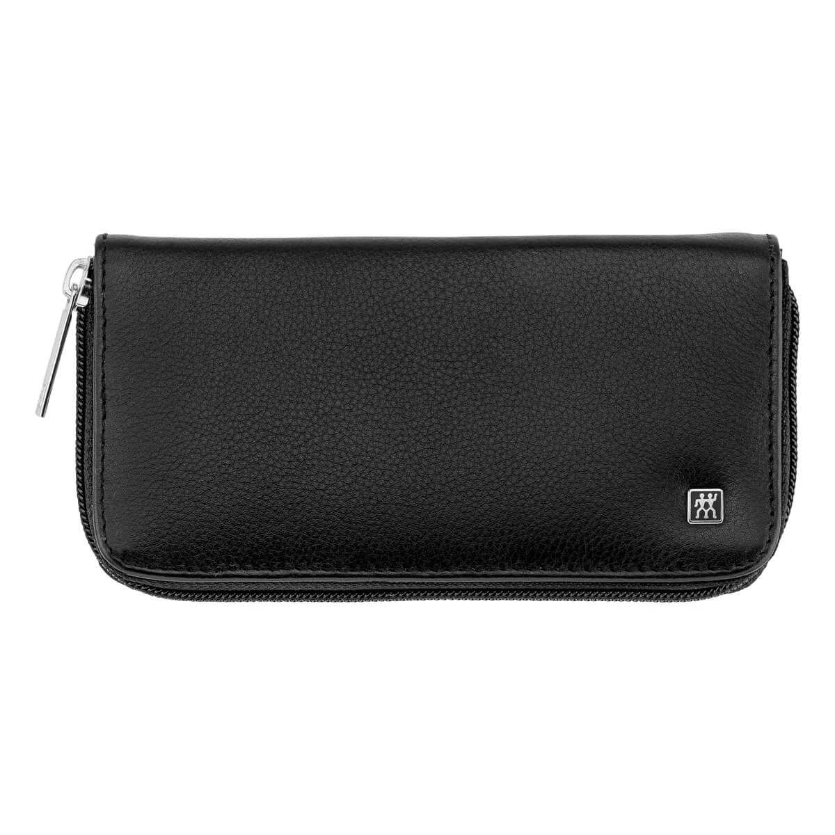 - Elegant svart läderfodral håller verktygen organiserade.